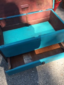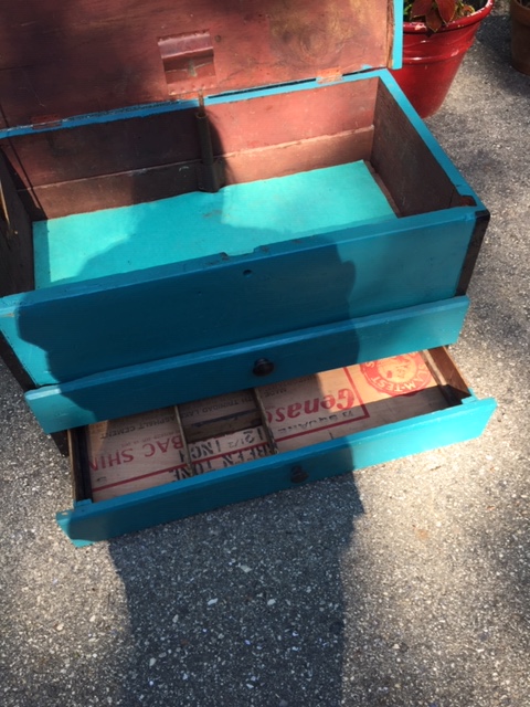Pretty cool blue chest with “Mobil Oil” stenciled on it. (I have no idea why or what the history is.) The chest has two drawers below (they’re somewhat “sticky”) and recessed metal handles on either side.