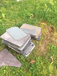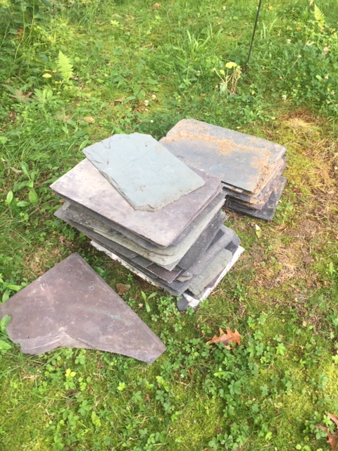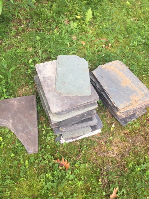 We have between 3-4 dozen old roofing slates. Most are in excellent condition with the original nail holes (given the fact that they are old), although there are some smaller, broken pieces.