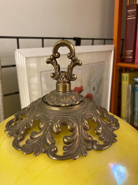 Dimensions: In its entirety, the lamp is about 4 1/2 feet high… it’s almost as tall as I am! The globe is about 14″ in diameter.