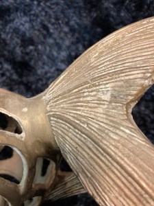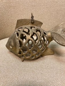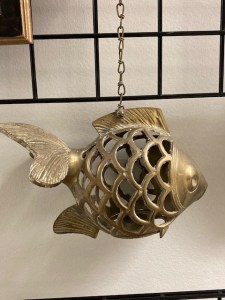 This vintage solid brass koi fish hanging candle holder comes complete with a chain and looks fabulous with a small candle inside on dark winter nights… or hang him outside during one of those great summer evenings next year when you have friends over!
