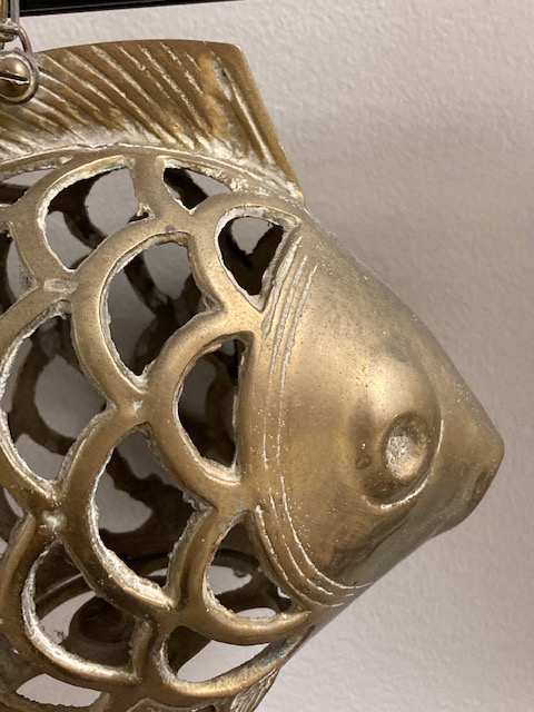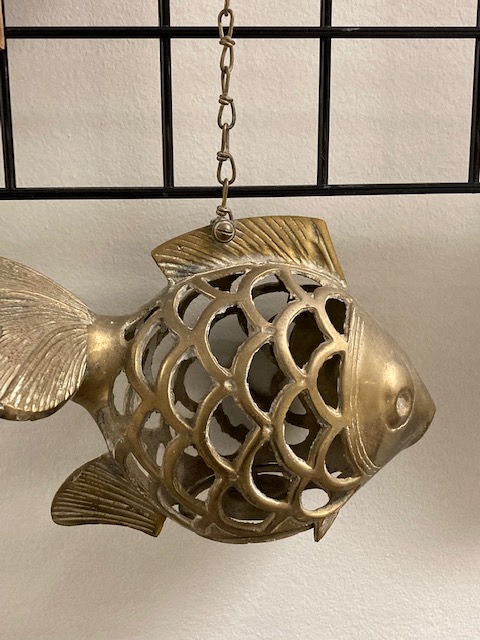 This vintage solid brass koi fish hanging candle holder comes complete with a chain and looks fabulous with a small candle inside on dark winter nights… or hang him outside during one of those great summer evenings next year when you have friends over!