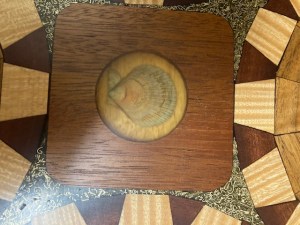 This table, crafted by Farley Assets of Thomaston (ME) is true craftsmanship. Look at the detail! It even has a seashell sealed in the center.