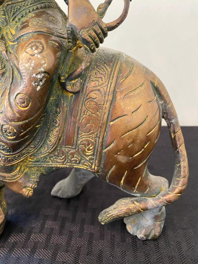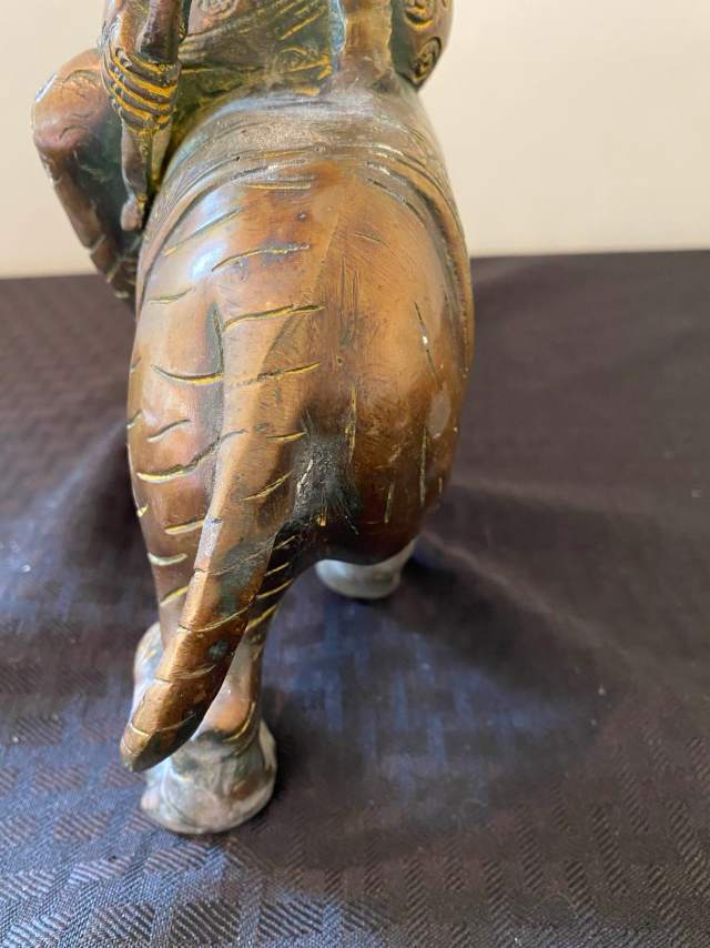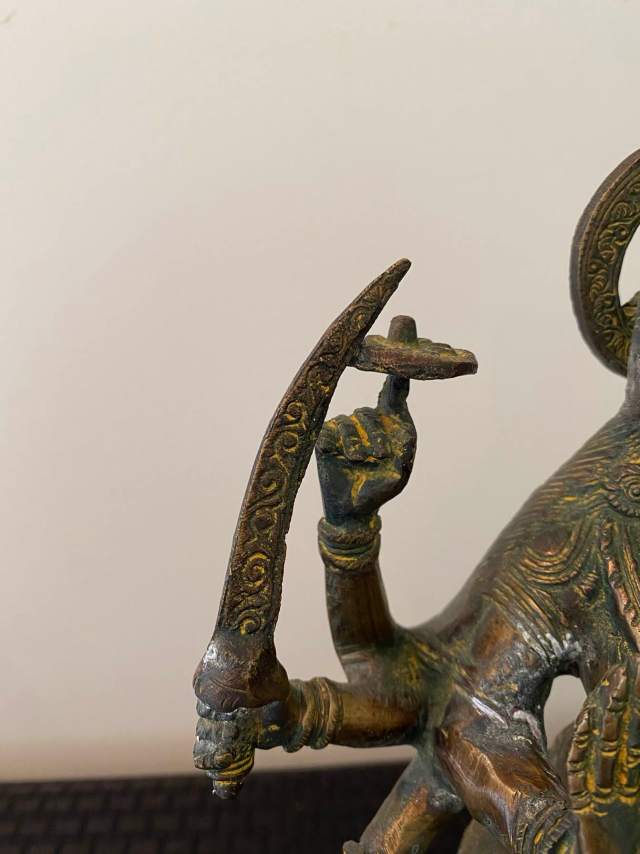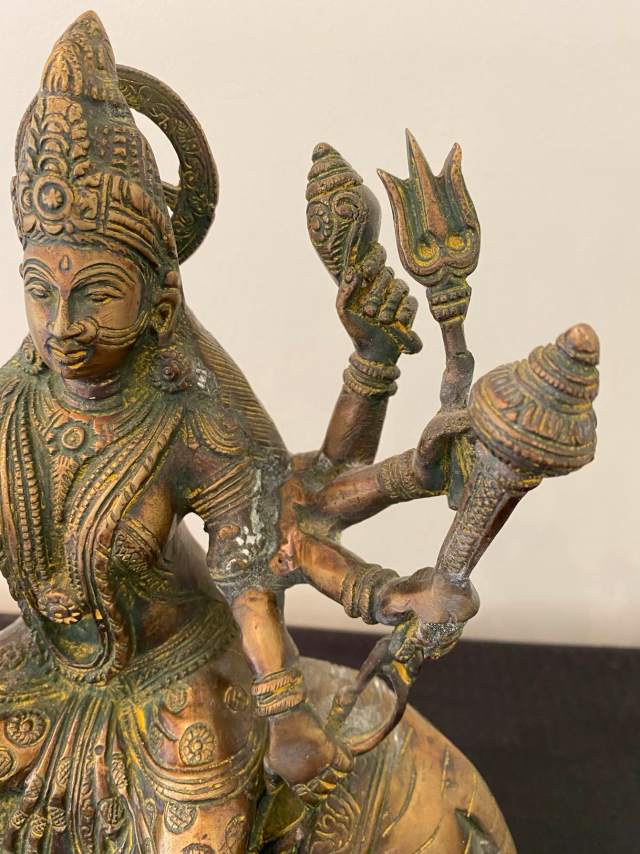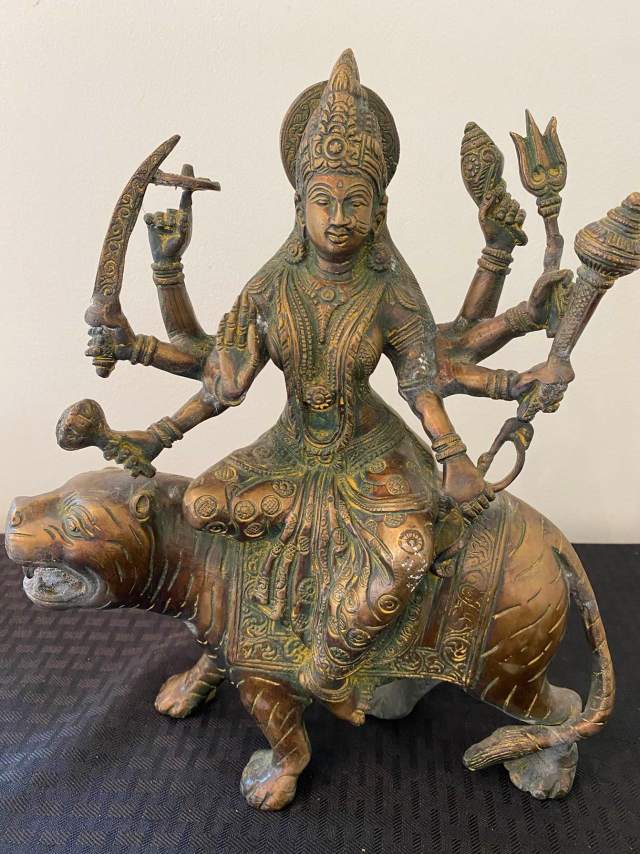 This is an amazing vintage/antique bronze statue of the Hindu Goddess Durga. She is seated on a tiger and has 8 arms, seven of which hold a weapon. The palm of the eighth arm is near her chest, facing outward.