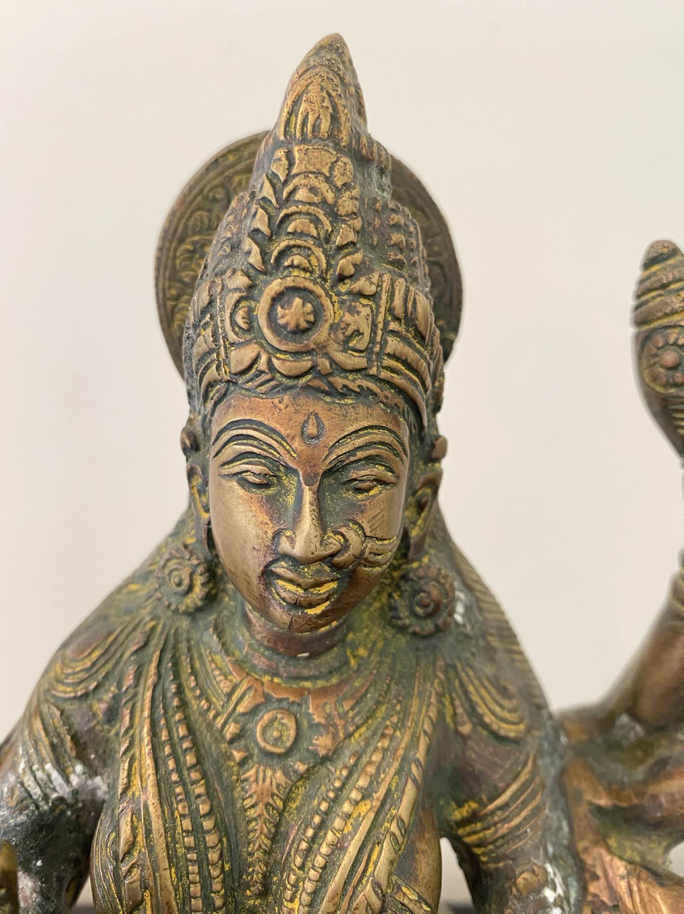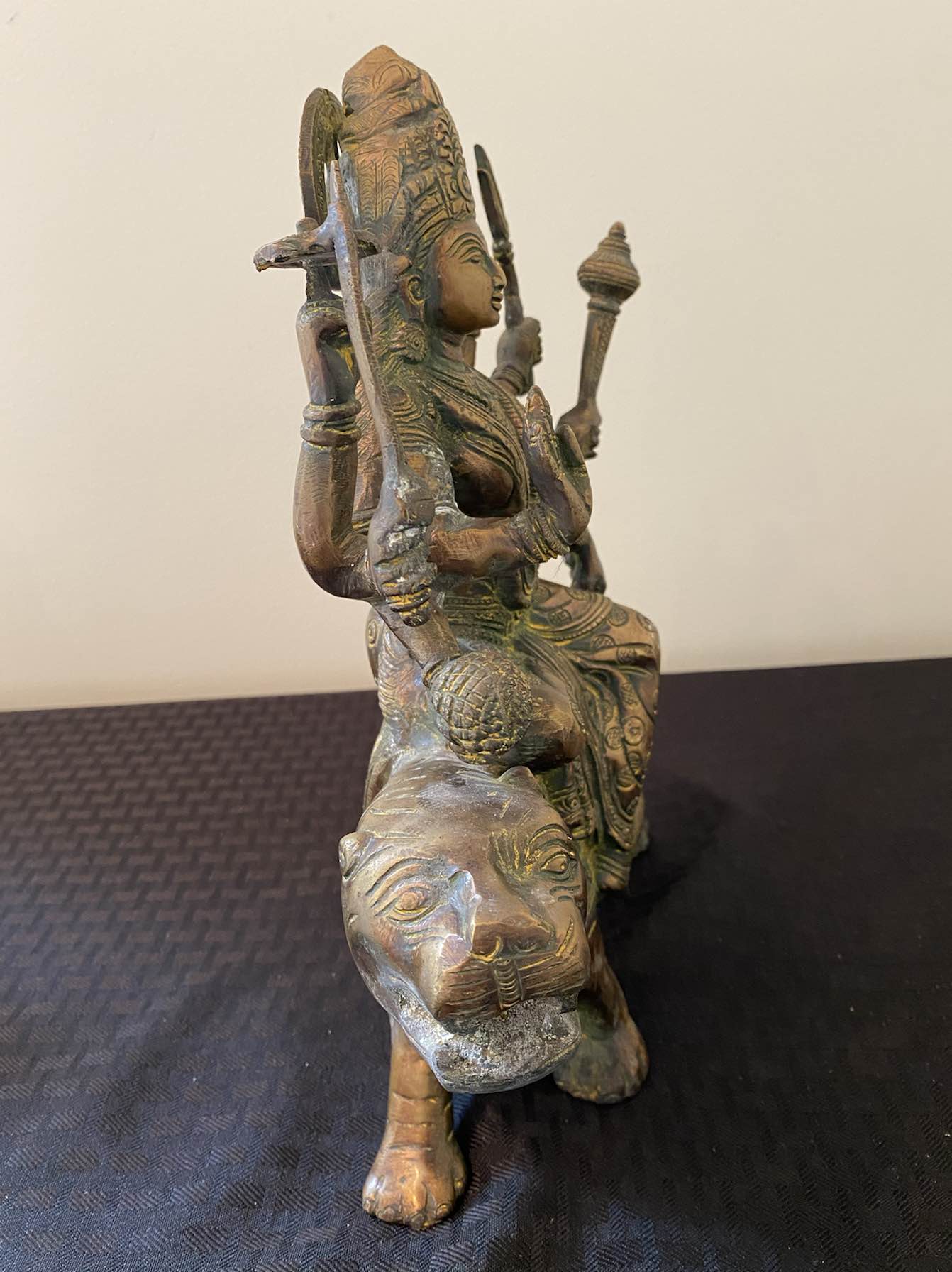 This is an amazing vintage/antique bronze statue of the Hindu Goddess Durga. She is seated on a tiger and has 8 arms, seven of which hold a weapon. The palm of the eighth arm is near her chest, facing outward.
