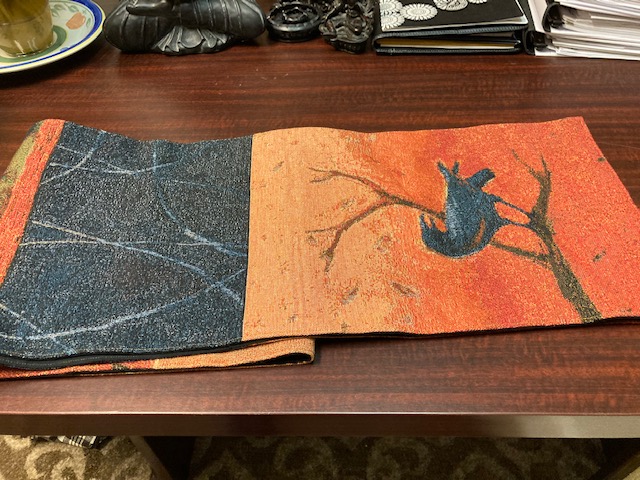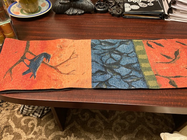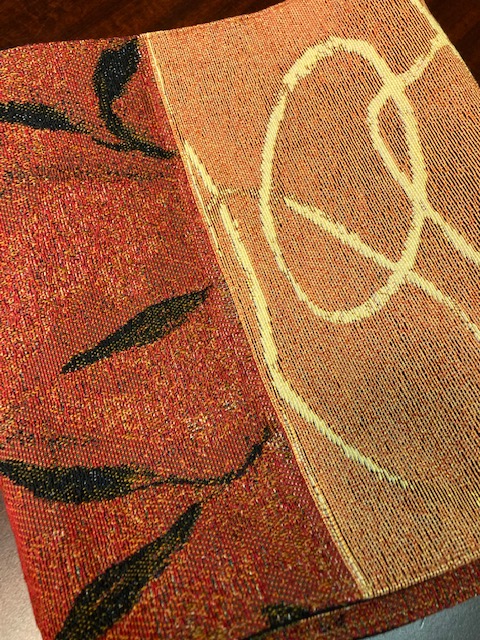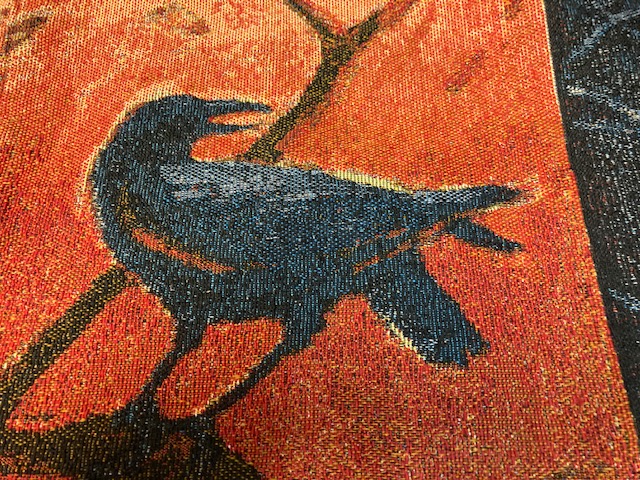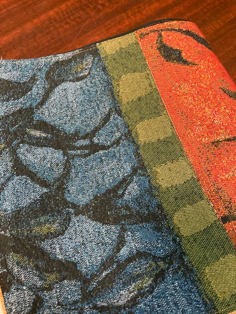 The material is tapestry style, backed by black fabric. The colors are vibrantly beautiful.