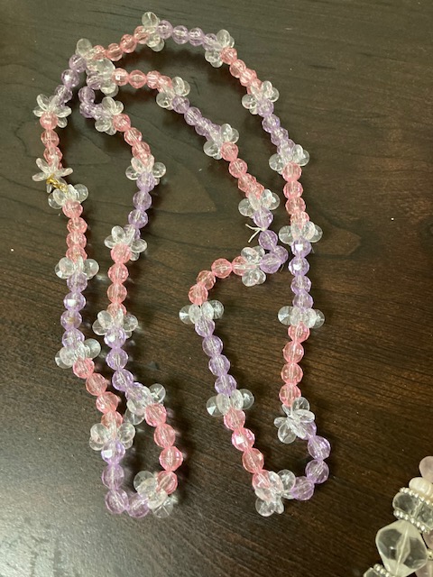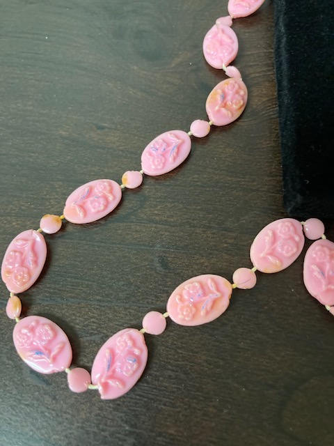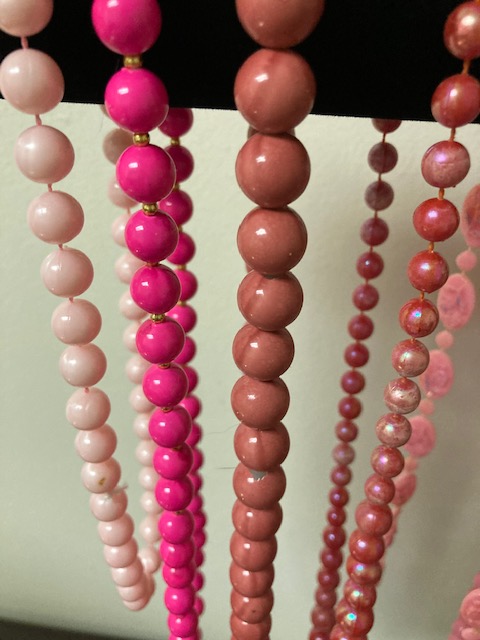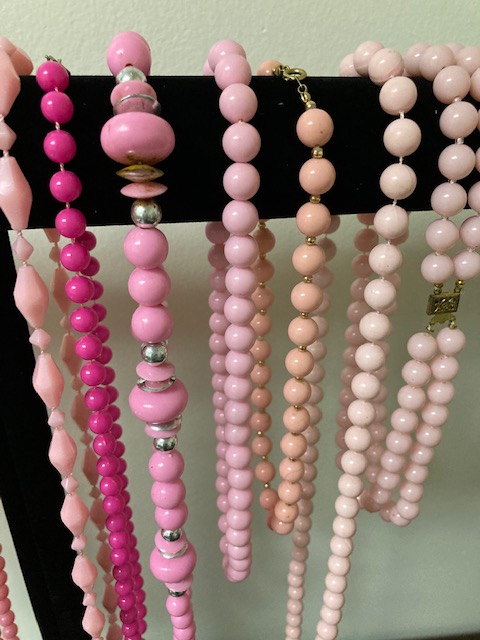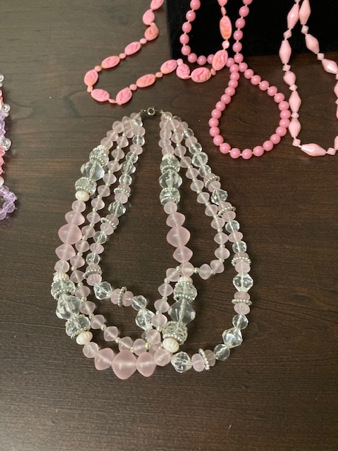 If pink is your color, here are 15 different necklaces of all shapes and sizes, just waiting for you! The one on the far right has a double strand, and you’ll see a photo in the gallery below of a necklace with matching clip on earrings.