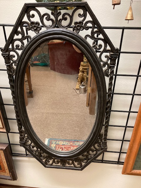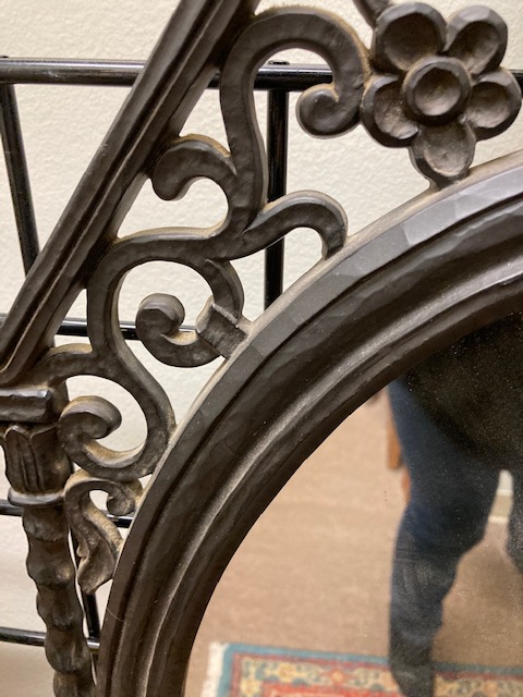 This is a nice mirror in great condition, that would fit with many different types of decor. The material is that good quality, heavy duty plastic-type material designed to look like Mediterranean metal work.