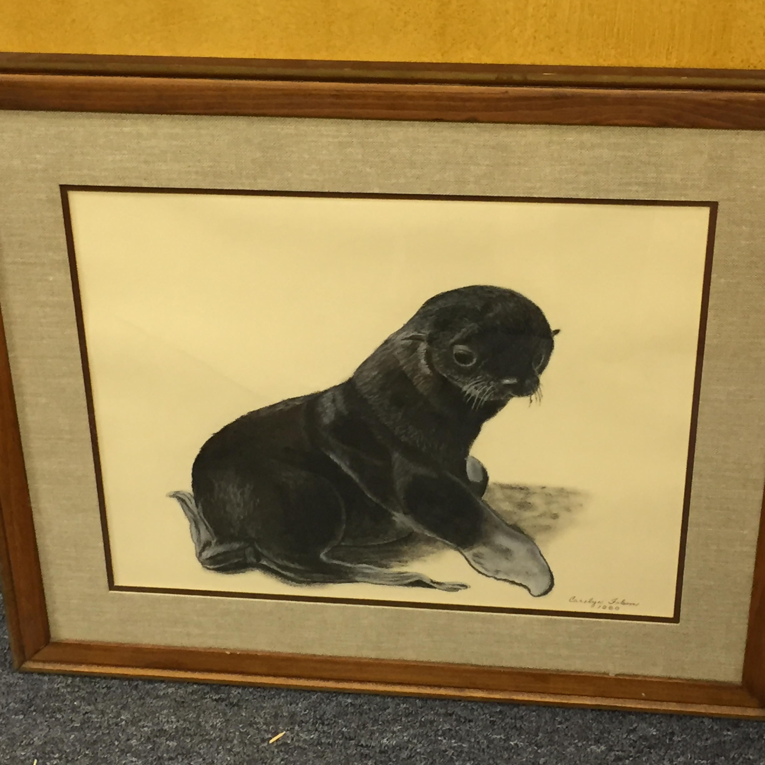 This pencil drawing of a baby seal is just lovely and totally sweet, and is signed by the artist and dated 1980. The matting is well done, as is the frame, although the latter has suffered some minor dings over the decades.