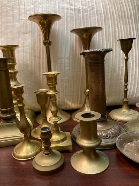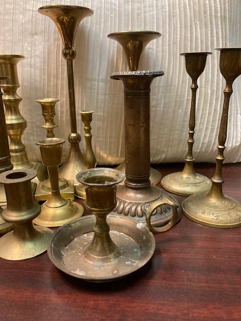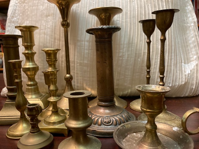 We have several brass candlesticks in stock – ready to help you manage those pesky but happy-making pieces of jewelry!