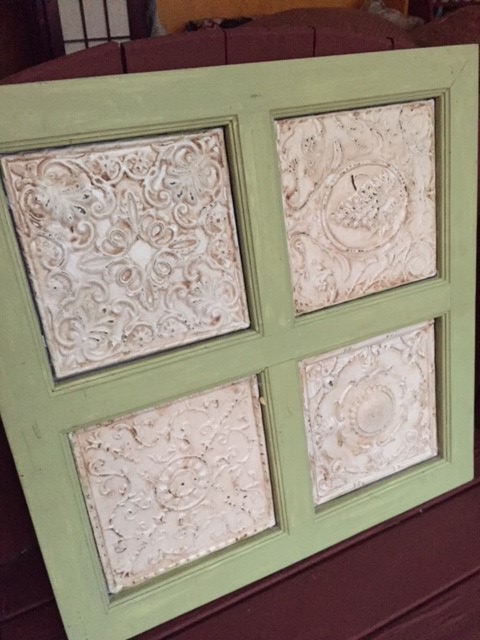 This is a lovely French country-style, two over two tin paneled wall hanging. It’s painted to give a slightly distressed feel.