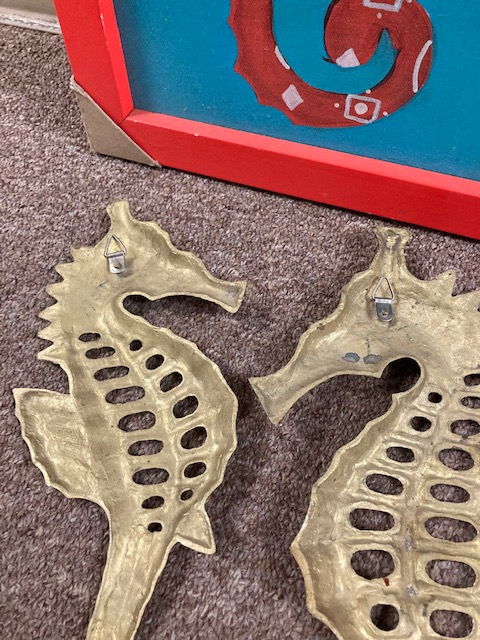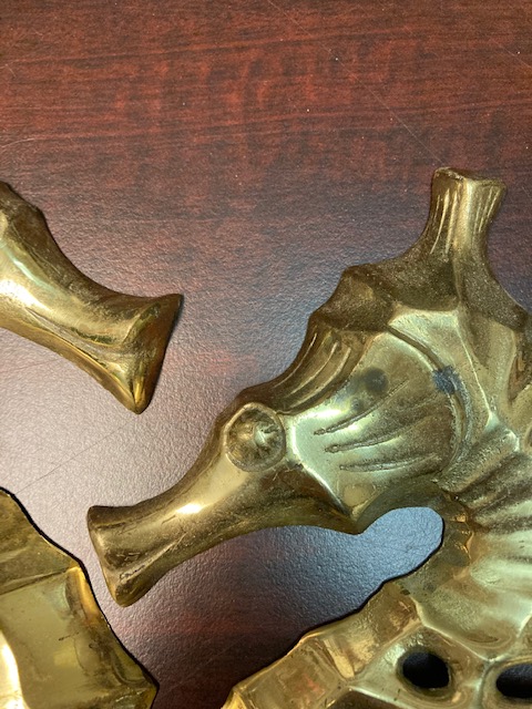 Pair of Brass Seahorses: Very good shape for their age. The smaller one has some of the greenish oxidizing tinge. They both have small hangers on the back as seen in the photo,