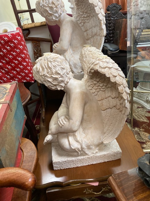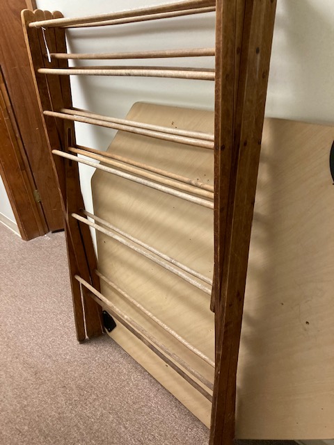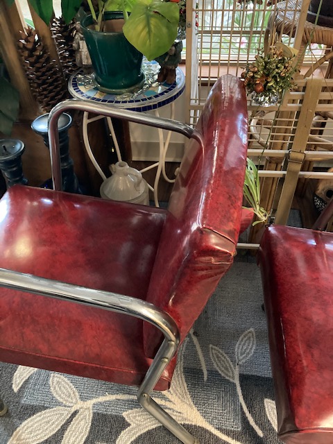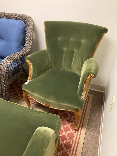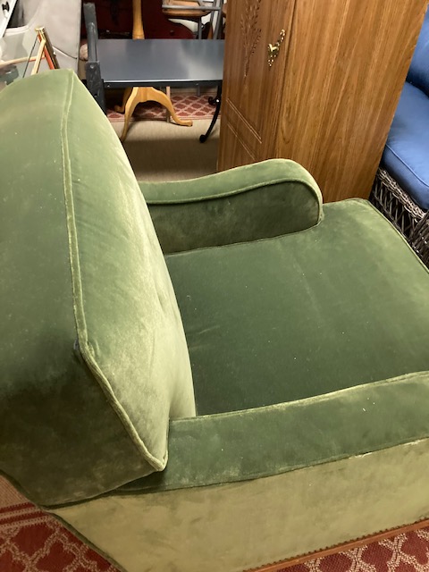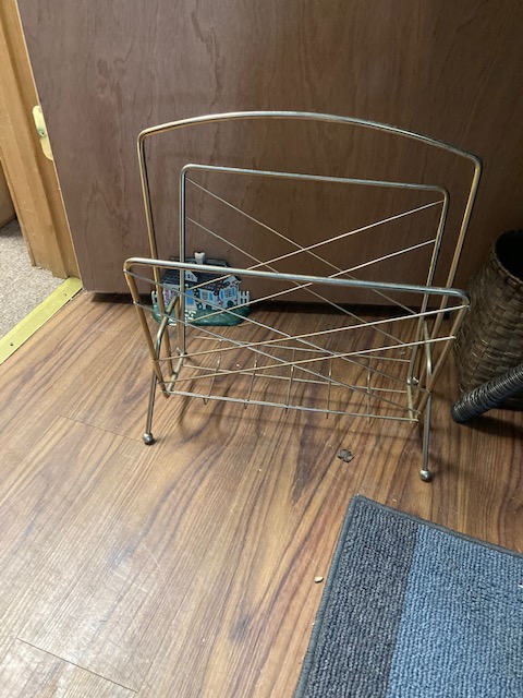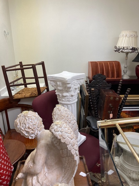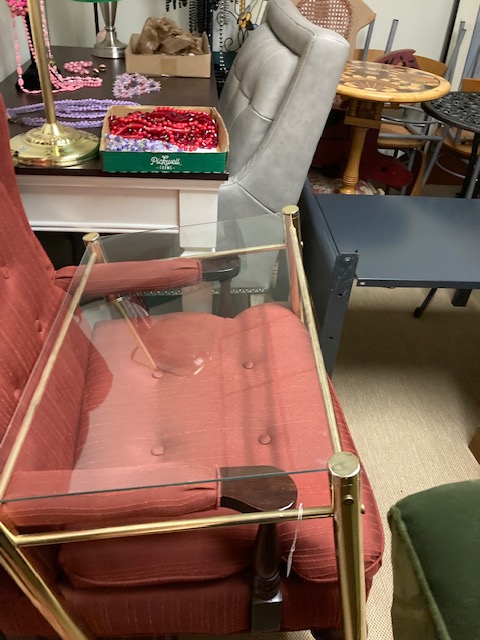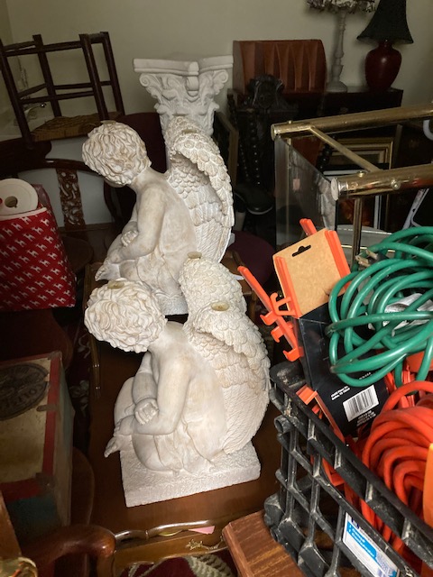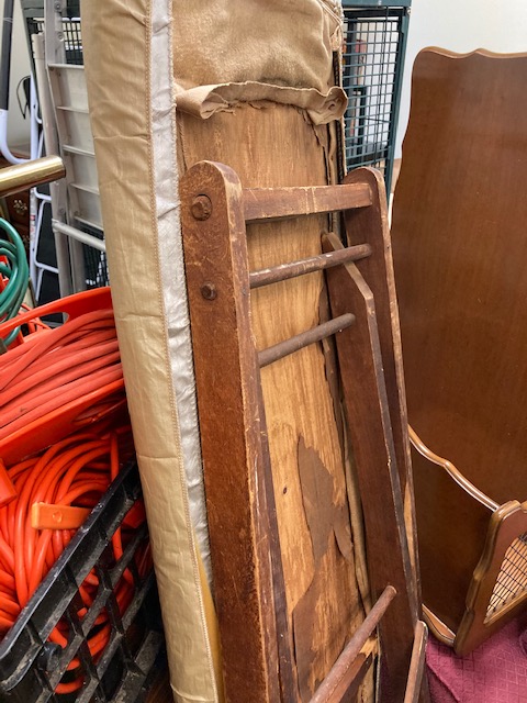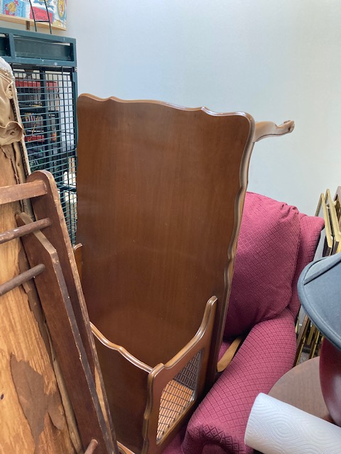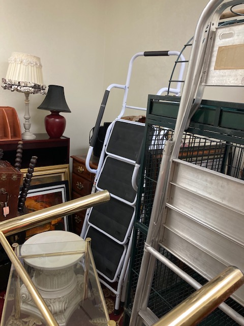 There’s everything from a couple of ladders, to a wooden ironing board, a wooden clothing drying rack, two lovely green velvet chairs, a couple of MCM red chairs, small chalkware cherub end tables with glass tops, French Provincial wooden side tables, a marble top coffee table, an inexpensive, no frills corner computer desk… and more!