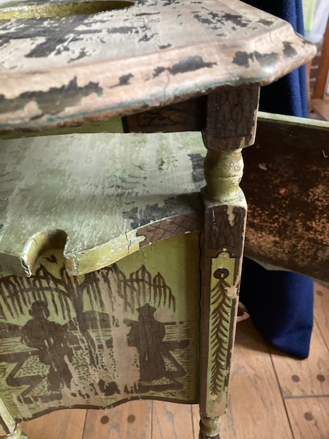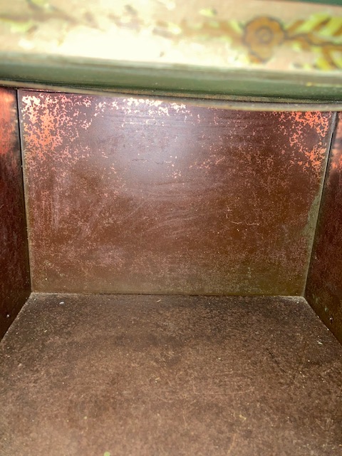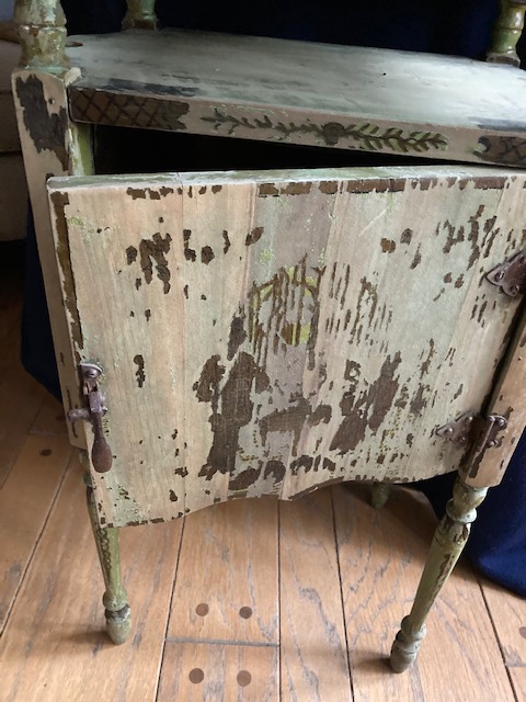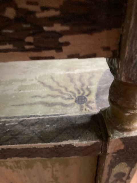 To my relief, it’s not at all a piece of junk, although it’s apparently been in storage with unregulated temperature for quite some time as the highly detailed paint job is pretty much worn off. The piece appears to have been primarily green with stenciling on all four sides and the top. At first glance, I thought the stenciling was perhaps a Pennsylvania Dutch pattern, but on closer look, I don’t know what it is.