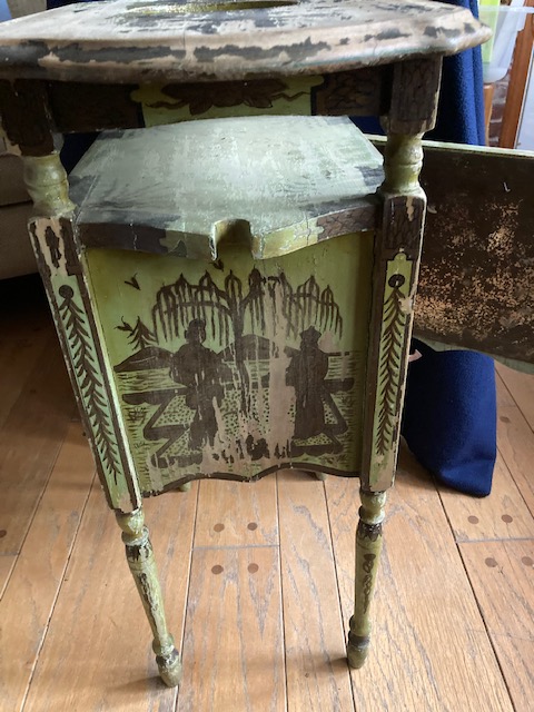 There should be a big old ashtray in the middle but that’s missing. There’s a notch on either side to hold a pipe. The cabinet is metal lined, so originally was a humidor for tobacco and cigars.
