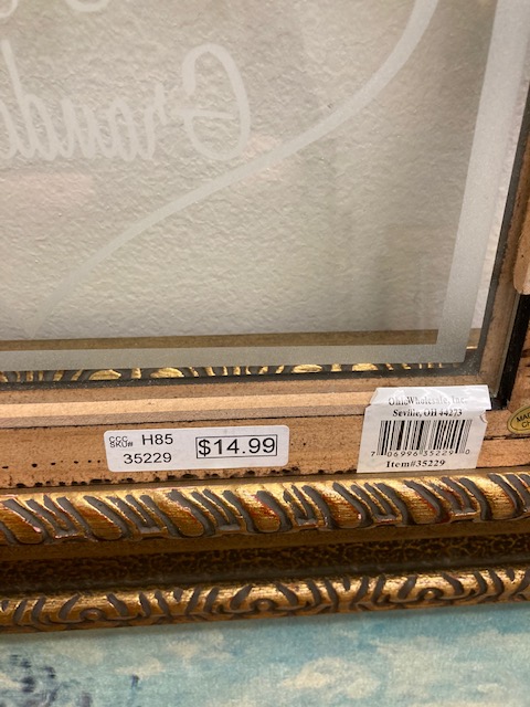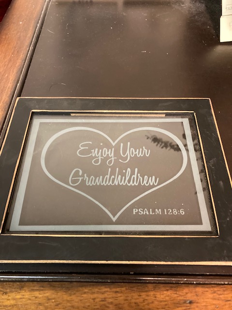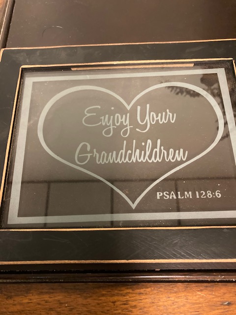 This is a sweet little wall hanging, with the etching “Enjoy Your Grandchildren” enclosed in a heart. The wood frame has a slightly distressed look to it.