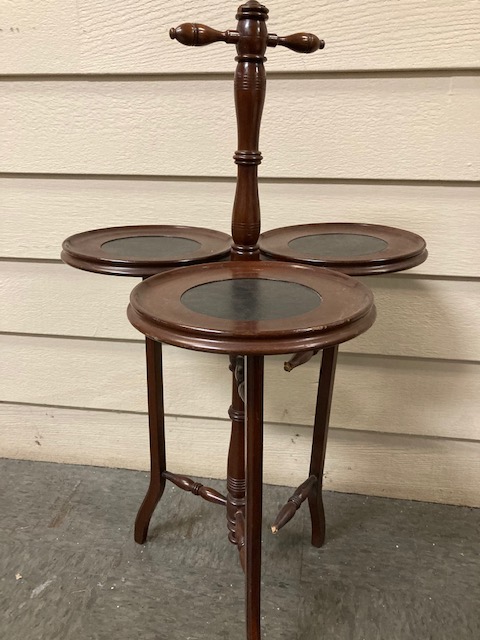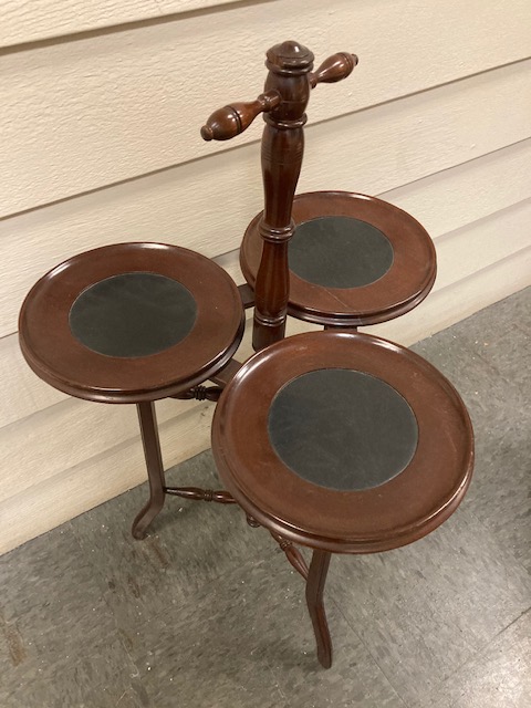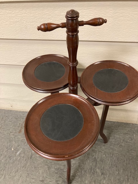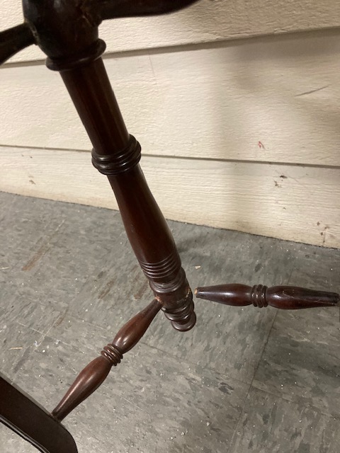 Condition: Fair to good. The stand is a decent vintage piece without a lot of wear and tear, and really is quite cute, but the peg on one of the two stretchers on one leg has broken off. The other hasn’t broken but needs to be re-glued. My intent is to repair the piece – which won’t take a lot of work or skill – but that’s up to you.