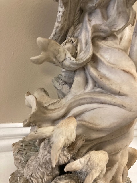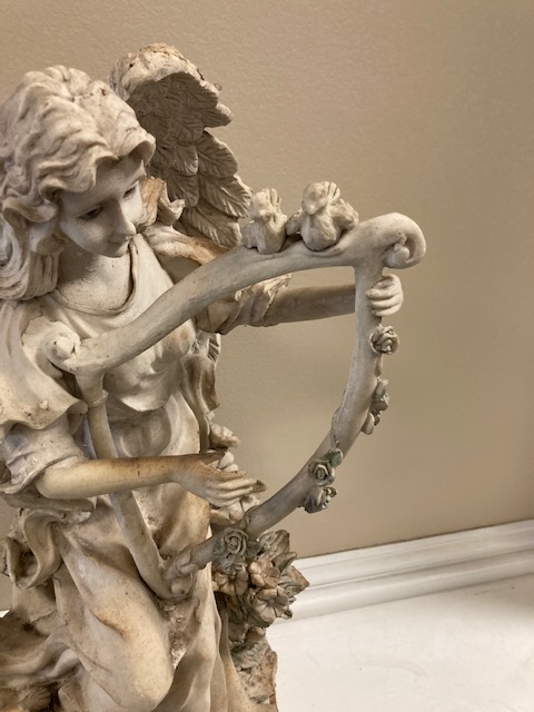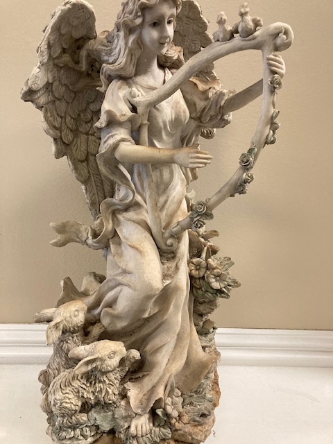 Our Angel with Harp & Bunnies seems to be an older, probably discontinued, design, as we can’t find this exact piece via an internet search. She’s made of a resin type material and therefore lightweight for her size. She’s in excellent condition, although she’s definitely been outside, as seen in the discoloration due to weathering.