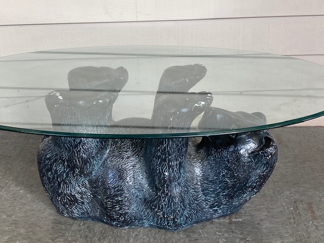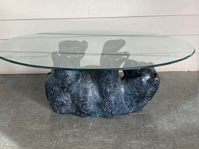 Dimensions: The bear is 15″ high x 15″ deep x 26″ long. The glass top is 43″ wide by 32″ deep by 1/4″ thick. This is a large coffee table.