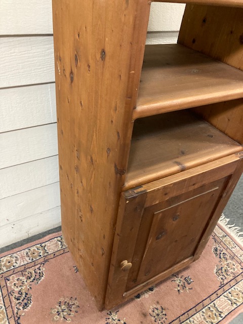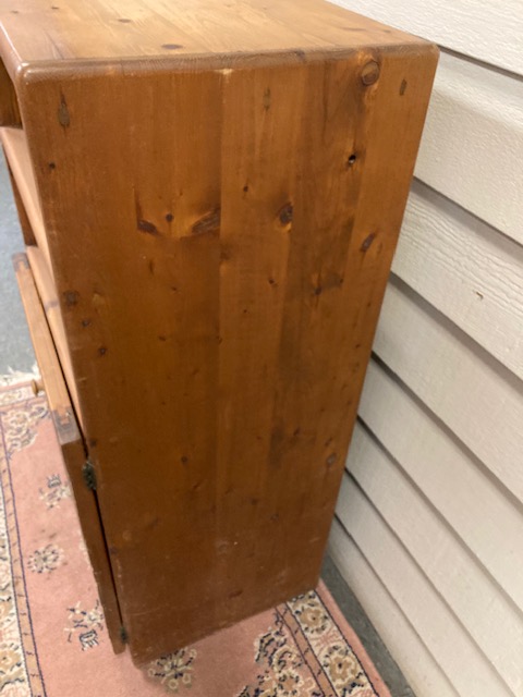 Condition: While it has a number of small dings and scratches on the exterior, it is solid pine, and the shelves and cabinet are all clean and in excellent shape. It is very sturdy and can hold probably anything you want to store in it (canned goods, wrench sets, etc)!