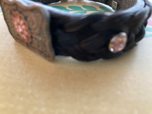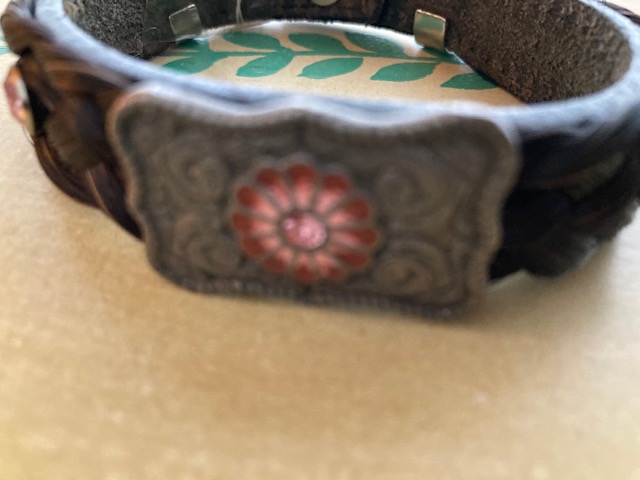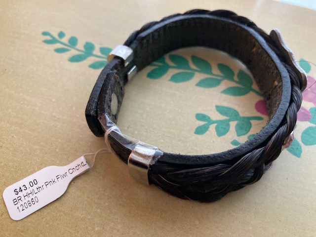 Bracelet: One brown horsehair bracelet with engraved silver-colored metal and pink flower. Snap closure. Original price: $43.00. Our price: $9.00.
