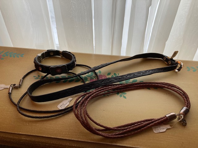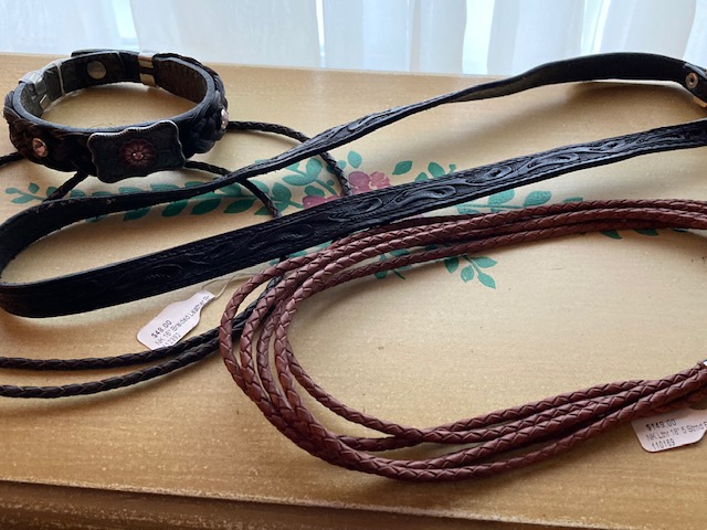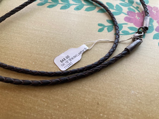 Cords: Two 16″ braided leather cords with lobster claw clasps. The original price for each was $48.00. Our price: $10.00 each.