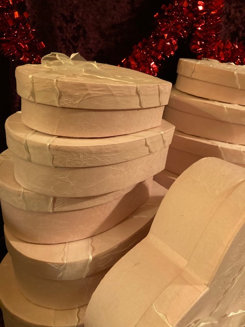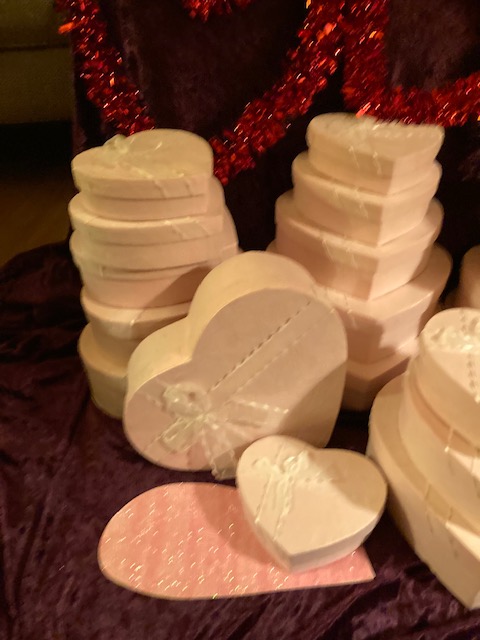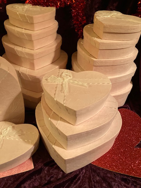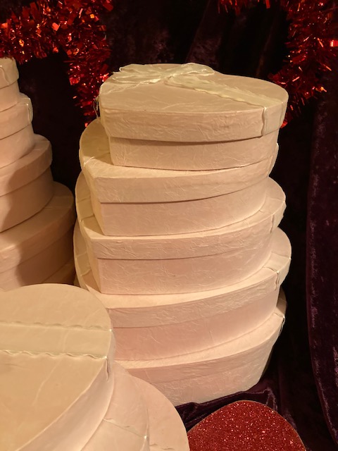 These are very good quality nesting gift boxes… not that flimsy stuff you see too often. Each has a white lace ribbon as decoration.