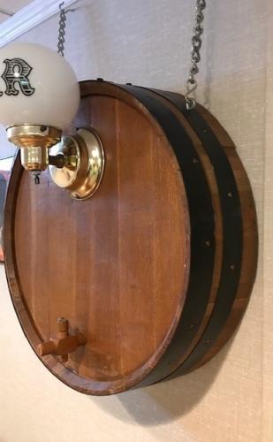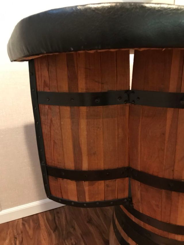 This is a fantastic vintage Whiskey Barrel bar and stool set by Brothers Furniture of Kentucky. Some internet research on a couple of occasions found no other set as complete as this one, with the bar (a whiskey barrel that’s been cut apart to make “wings” that hold a laminate bar top, along with storage space for liquor and bar needs), 3 stools (created from smaller barrels that have been cut down), a bar lamp and 4 pictures… the closest I found was the same bar with two stools for $2,495.00. I would have to say that for $1,750.00, ours seems like a very good deal!