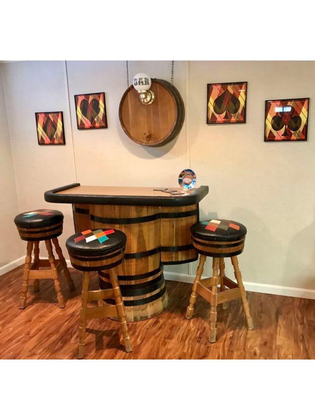 We found the following description from Brothers Furniture in an ad circa 1975, which said: Formal and fussy furnishings are fine for company…but for the kids and dad to really relax…well, you need something like this from BROTHERS of Kentucky. Built for fun, built for comfort, built to last! Don’t wonder where the kids are…they’ll be having fun at home. Don’t hesitate. You need to make this marvelous barrel bar and barstools yours.