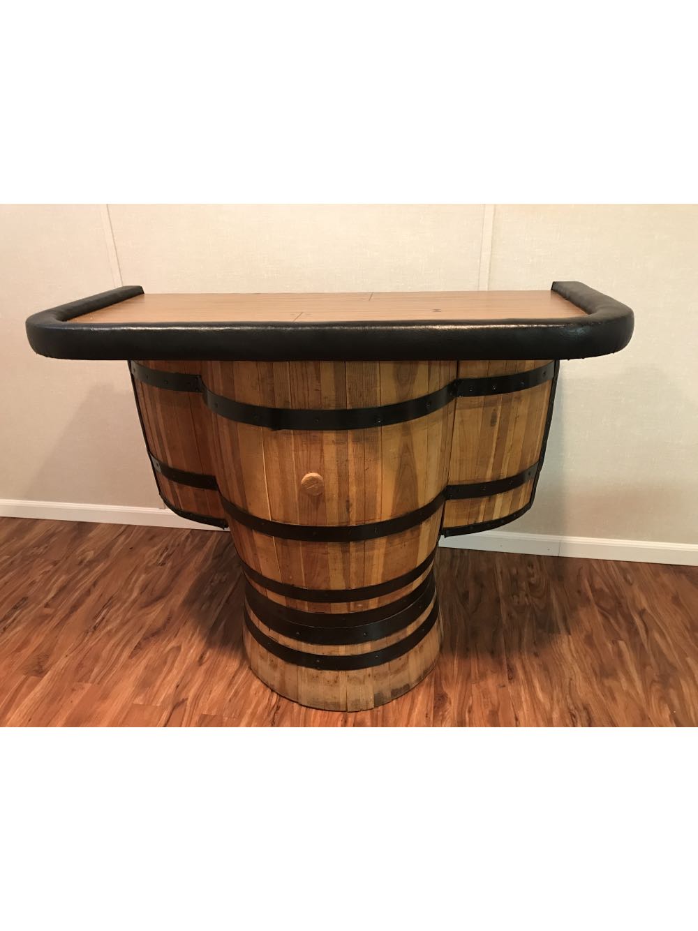 This is a fantastic vintage Whiskey Barrel bar and stool set by Brothers Furniture of Kentucky. Some internet research on a couple of occasions found no other set as complete as this one, with the bar (a whiskey barrel that’s been cut apart to make “wings” that hold a laminate bar top, along with storage space for liquor and bar needs), 3 stools (created from smaller barrels that have been cut down), a bar lamp and 4 pictures… the closest I found was the same bar with two stools for $2,495.00. I would have to say that for $1,750.00, ours seems like a very good deal!