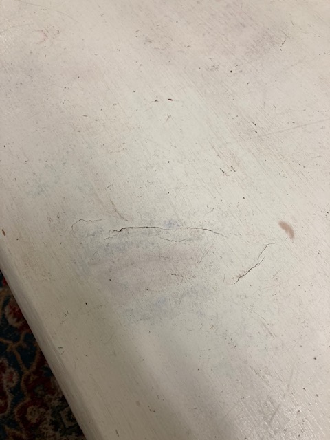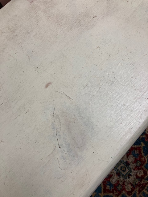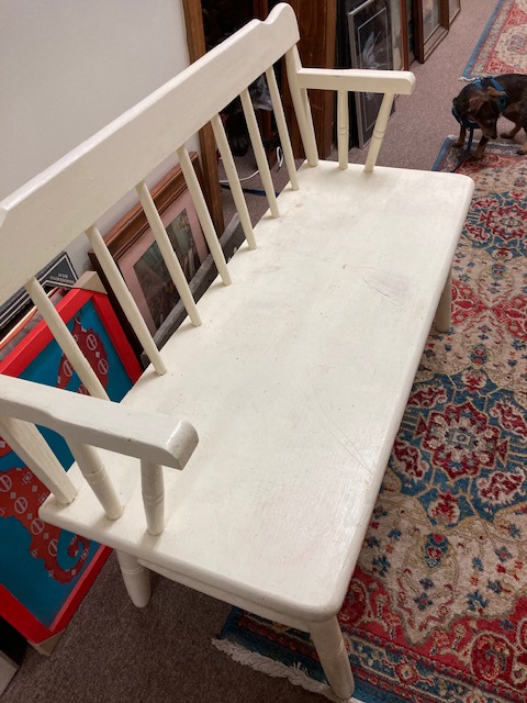 Condition: Very good, although there is a damaged area on the seat, as you can see in the photos. The knot holes are bleeding through the paint job, although that’s not unusual with an older piece like this. However, overall it is quite sturdy.