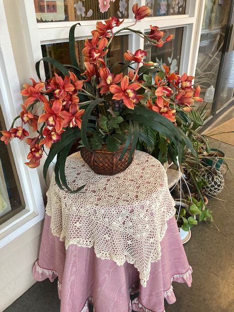 Dimensions: The table is about 28″ high by 20″ diameter. The floral piece is about 26″ high by 26″ wide.