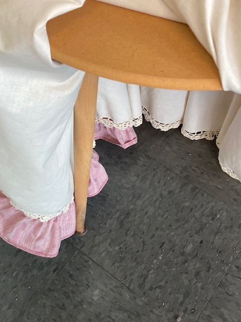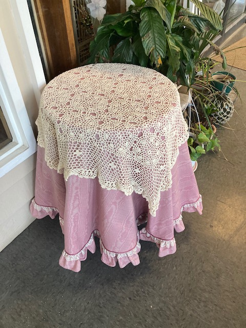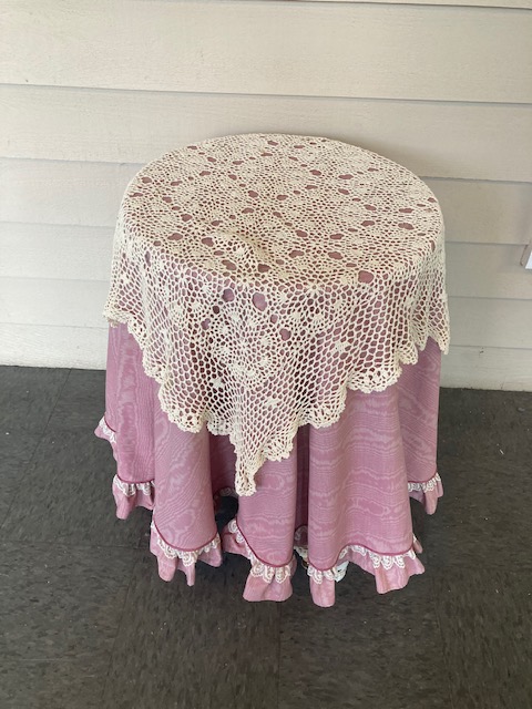 This is a great little accent table with ruffles and lace, to add warmth and color to a hallway or bare corner.