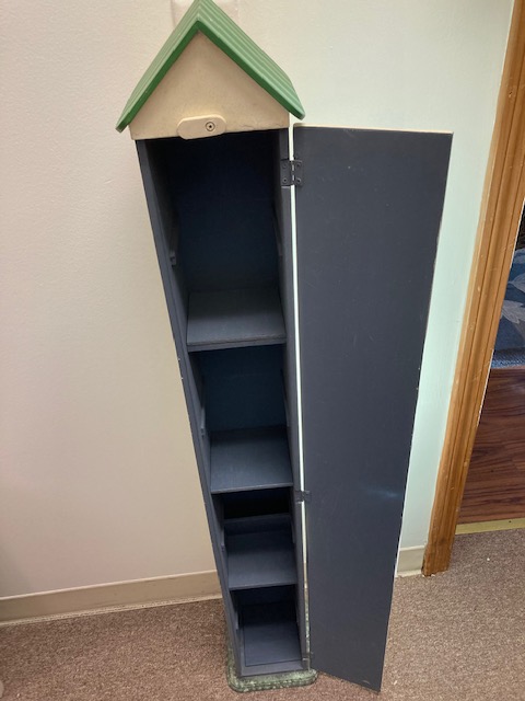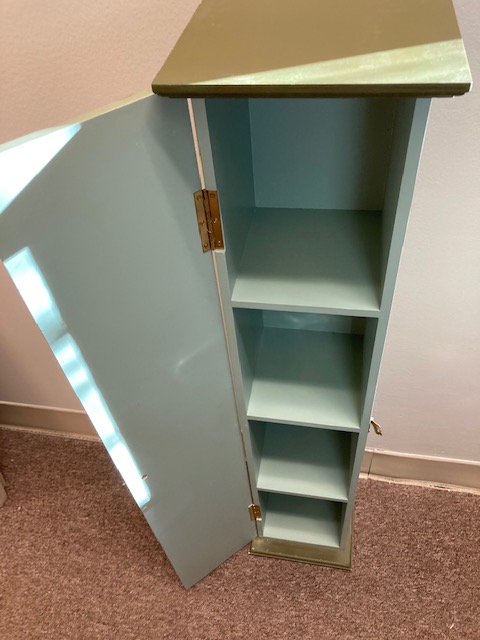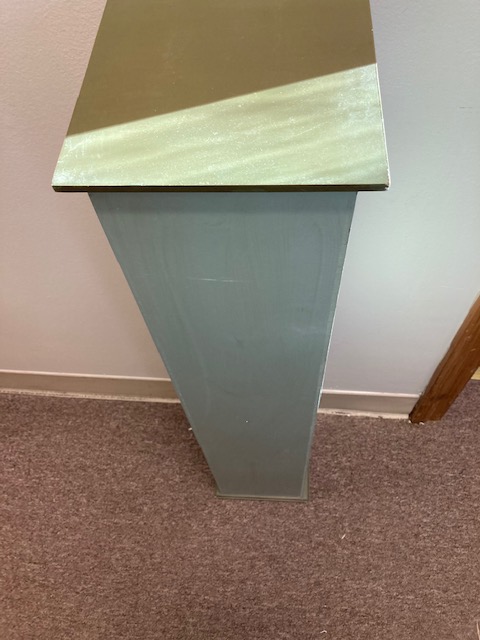 Shorter, green pedestal style shelf: 34″ high x 7″ deep x 7″ wide