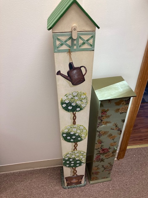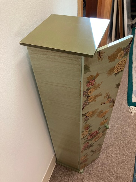 What a great way to dress up a narrow space or corner! The shorter shelf unit makes a great pedestal for a plant, lamp or framed photo; the larger, topiary themed shelf has a surprising amount of storage space inside.