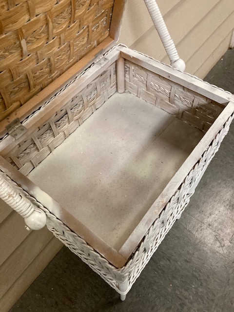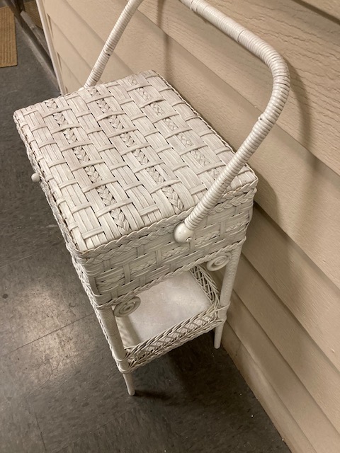 This is a great little wicker sewing or knitting stand, with both upper and lower storage. Apparently the natural wicker color has been painted over in white, although not completely on the inside. But it’s nice and clean!