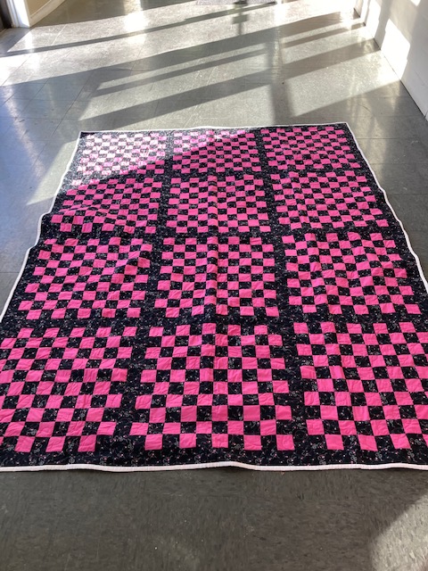 This quilt is just lovely with its cheerful bright pink patches tempered with the black floral ones. When I bid on this at a recent auction, I had no idea that apparently the quilt maker was related to the auctioneer – possibly his mother, based on the name safety-pinned to a small piece of paper on the back.