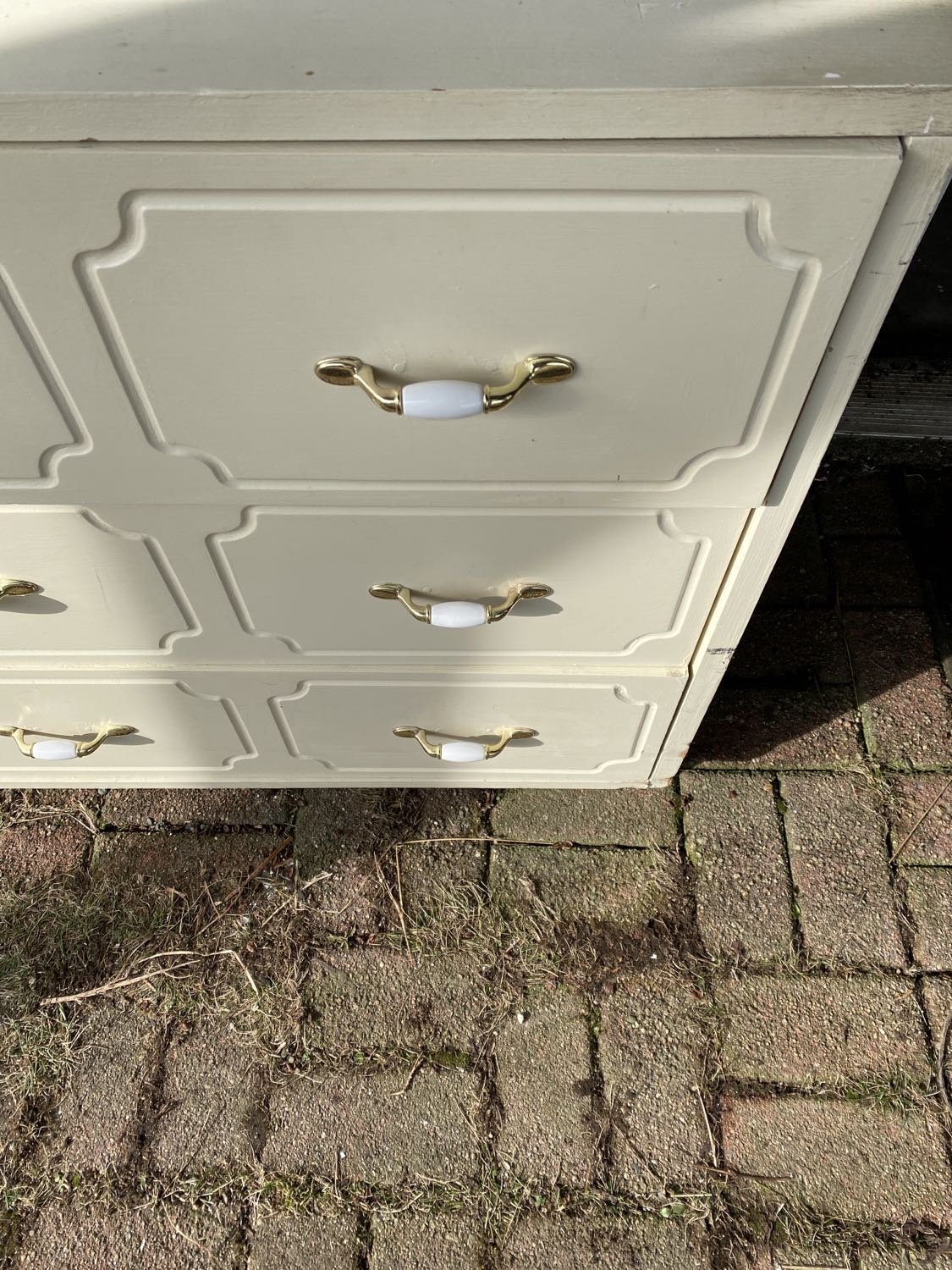 Condition: The dresser is in good condition, the hardware is intact and the drawers move as they’re supposed to. There is some minor wear and tear as the photos show, but otherwise it’s in nice, usable condition.