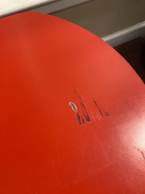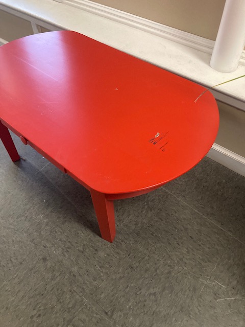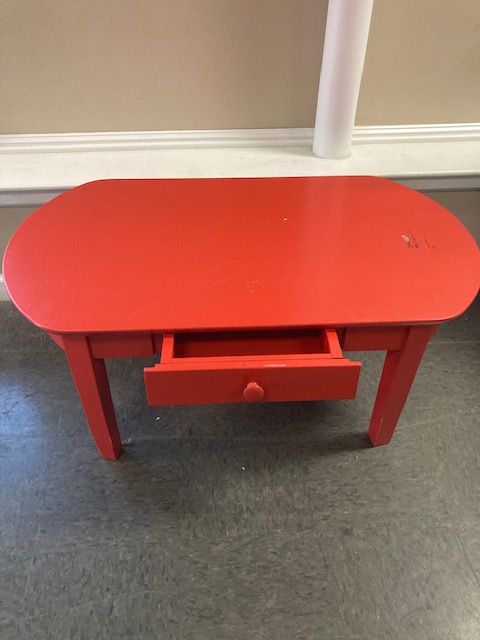 This is a good, very solid coffee table that someone decided needed to be spiffed up in bright red paint. I think it was a great idea and if I hadn’t turned the family room into a library, I’d put this table in there (along with the bright red bookcase for sale on our next post), and other kid-friendly furniture!