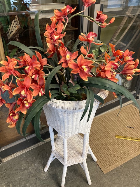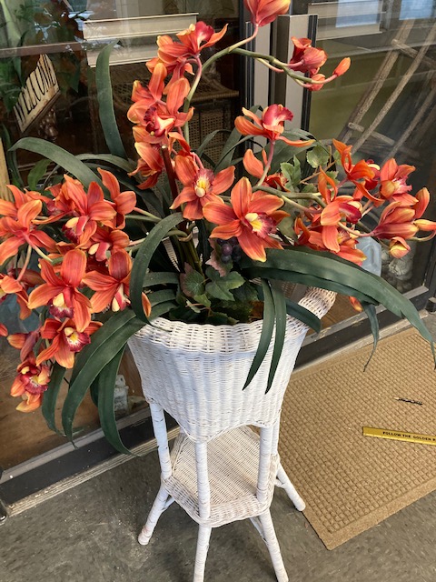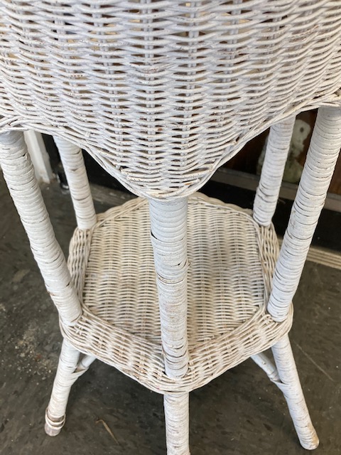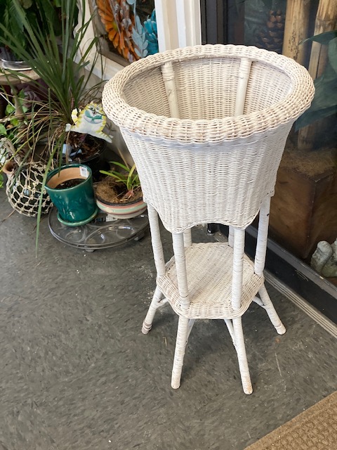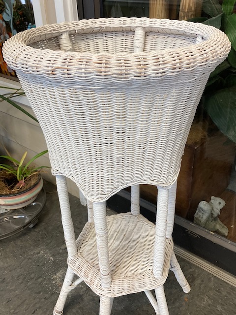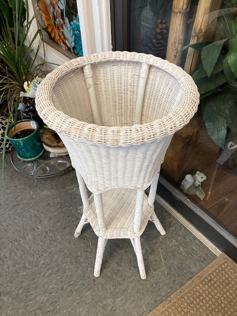 This is a wonderful old white wicker plant stand. It appears to have been used inside only, and either it had a faux plant inside, or someone was very careful when watering a real plant… it still looks great!