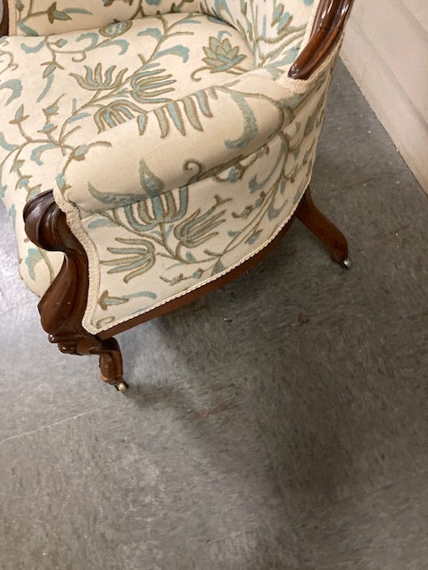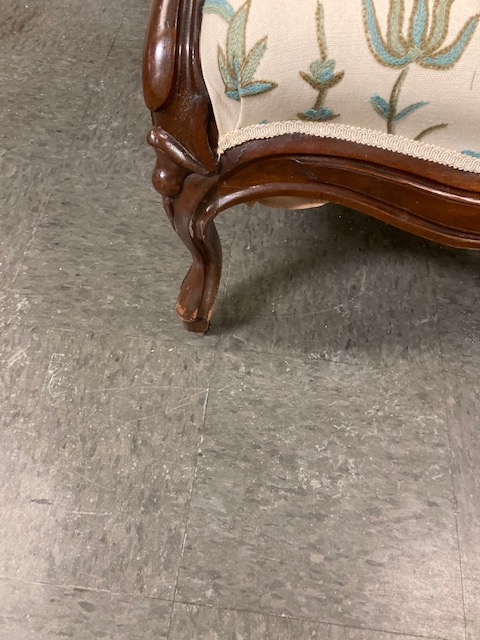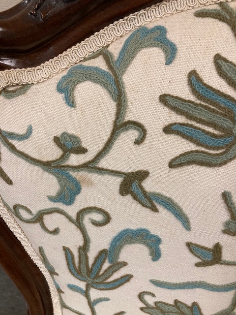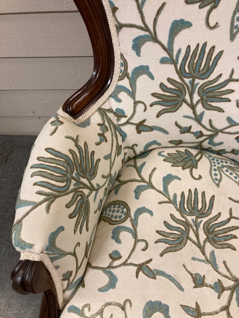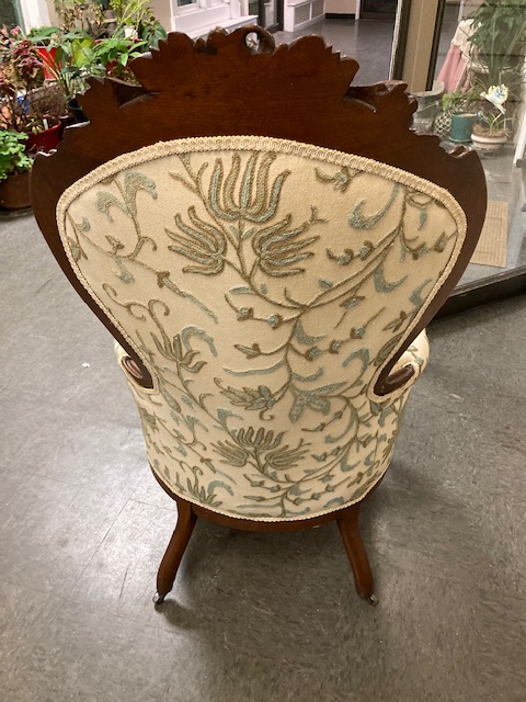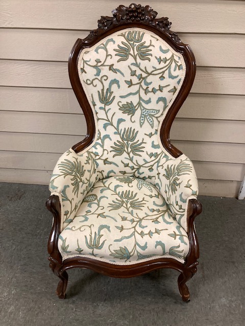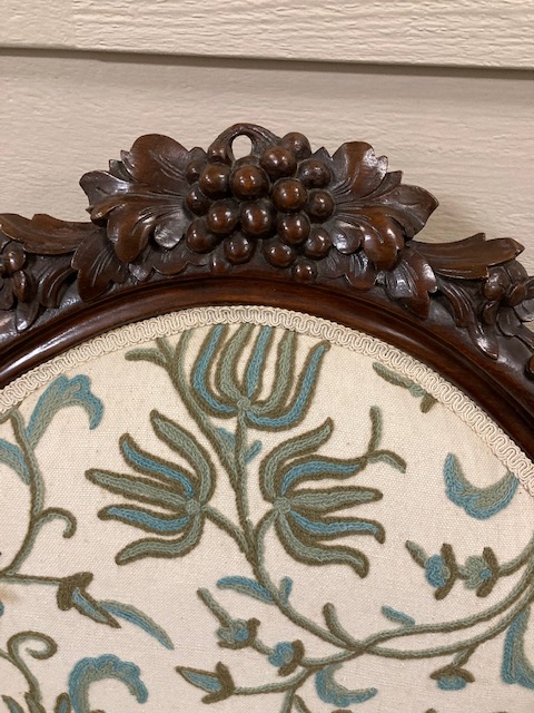 This is a wonderful old mahogany chair, which evokes the excesses of the Victorian era – at least, when it comes to furniture. Not only is the back intricately carved with grapes and leaves, but it has that raised upholstery fabric where the design isn’t woven into the fabric itself. It’s not “tufted”, but I’m not sure what it’s called.