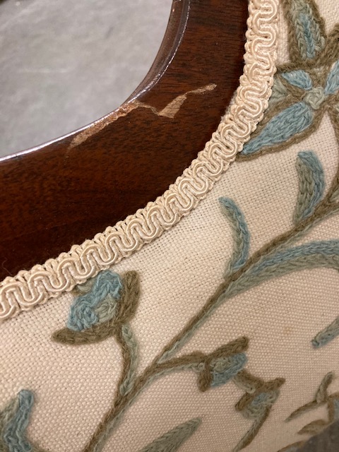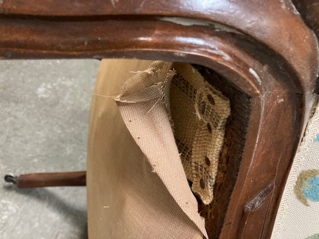 Condition: Very good. There are a couple of barely noticeable small stains in the fabric, the wood has some scuffs, and a small section under the chair needs to be restapled (see photo), but overall it’s in great shape.