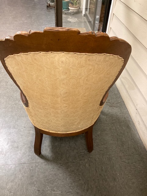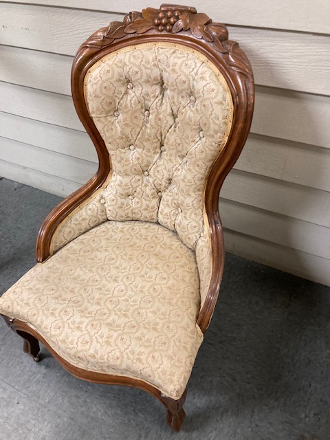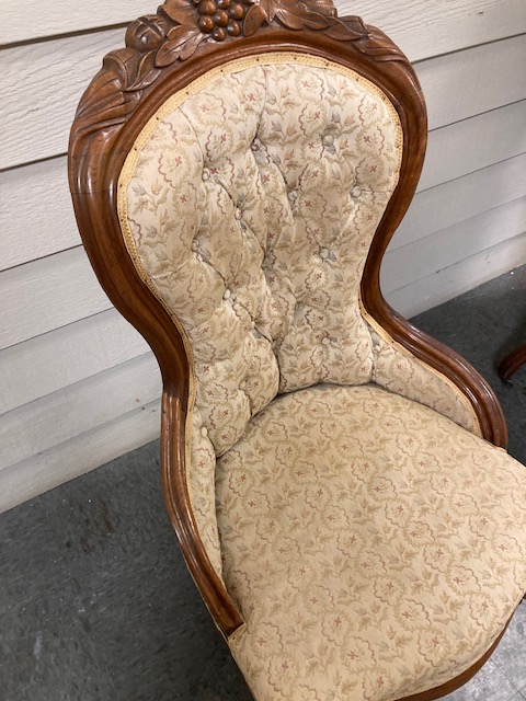 This is a wonderful old Victorian “grapeback” style chair, the hardwood top of which is intricately carved with grapes and leaves. It’s on the smaller side, so would fit easily in an unused area. And it’s adorable with muted colors. But…