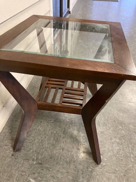 This is a nice solid glass side table or small coffee table in a mission style, with a shelf underneath. It would go with most decorating styles, but might look especially good in a mancave or camp!