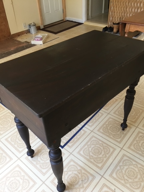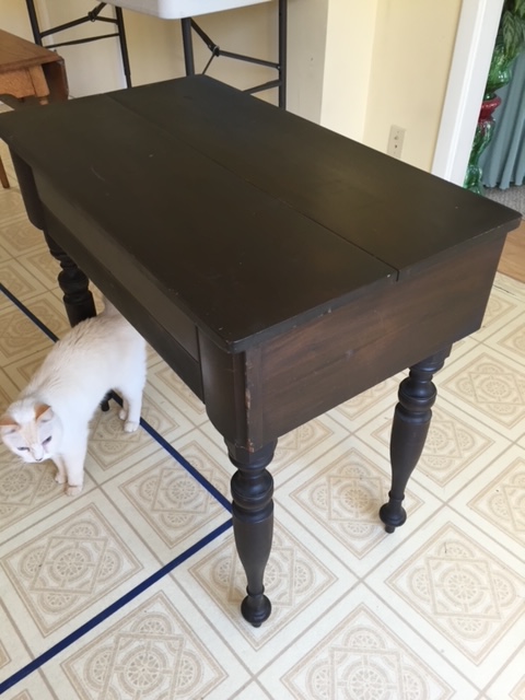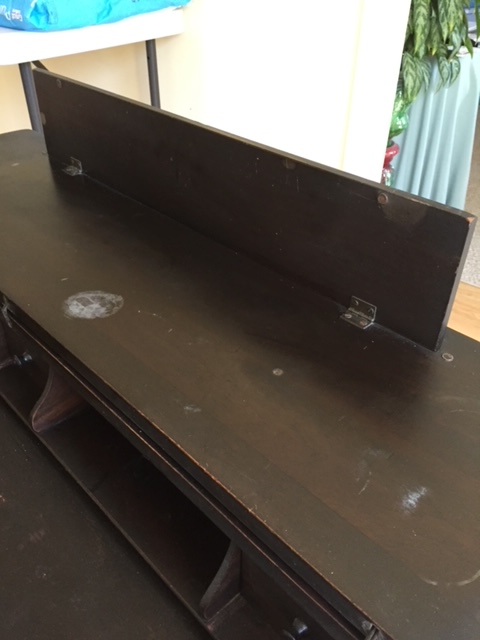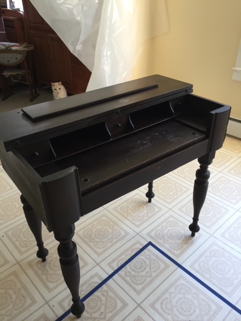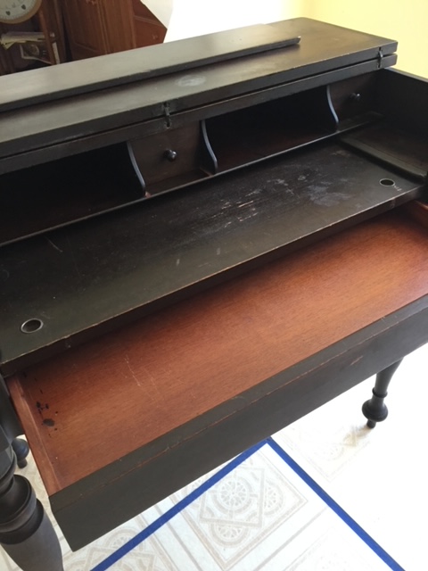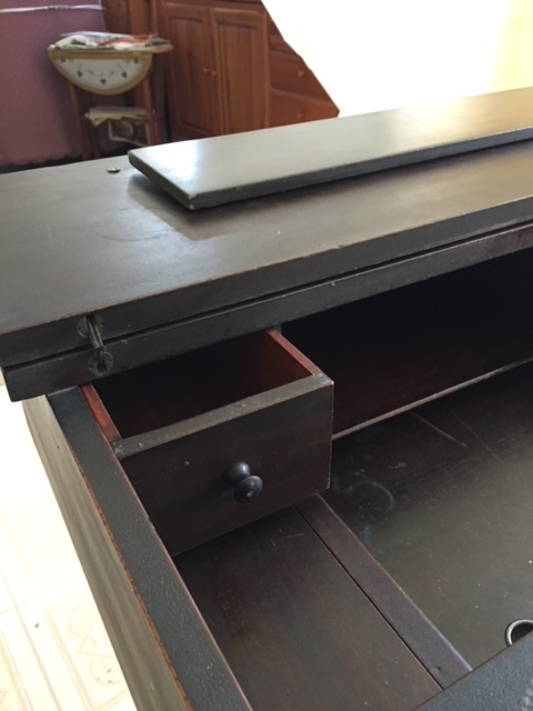 This is one of those wonderful antique desks with pigeonholes, little drawers and interesting spaces… It closes to a completely flat top, or opens to show all of its considerable features. It’s easier to have you check out the photos than to try to describe everything, but the basics are: 3 little drawers and a full drawer, 2 pigeonholes, 2 small “wells” (one on each side), and a writing tray that pulls out! (Oh, and apparently the legs do twist off for easier transport.)