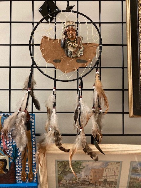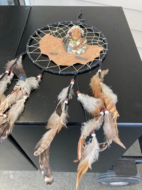 Here’s a homemade dream catcher that I found at a recent auction. It’s quite nice although the addition of the resin “Indian Chief” head is a bit unsettling. If I were to keep it, I’d consider removing that piece, although that may be what makes it special for you!