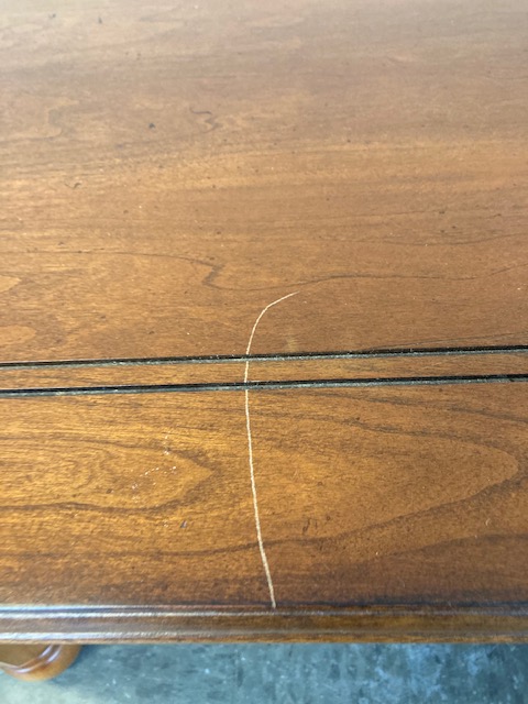 Condition: It was in near perfect condition when I purchased it, but the person helping me load the table into my Jeep was not quite as careful as I would have wished, and it sustained a scratch that’s fairly obvious (the photo that shows it up close makes the scratch seem worse than it is). It can probably be touched up with a furniture repair stick. However, for this reason, the price has been dropped below my initial expectation for this piece.