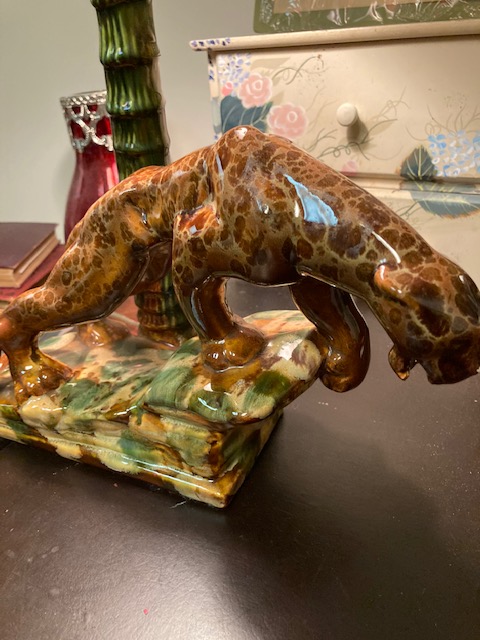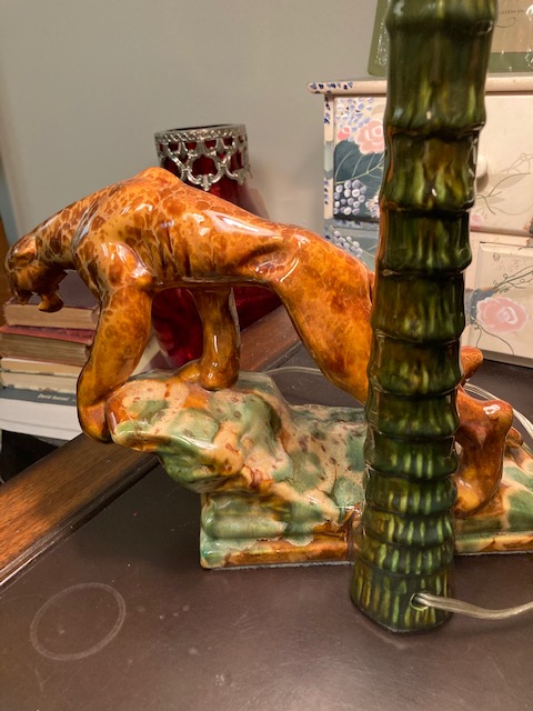 This is a very colorful lamp depicting a pouncing leopard. I almost think it was made by someone taking a ceramics class rather than commercially produced, because of the combination of colors, but then again, research shows several variations of a pouncing leopard/panther (in varying colors), dating back to the ’40s and ’50s. So, your guess as to its source would be as good as mine, I suppose.