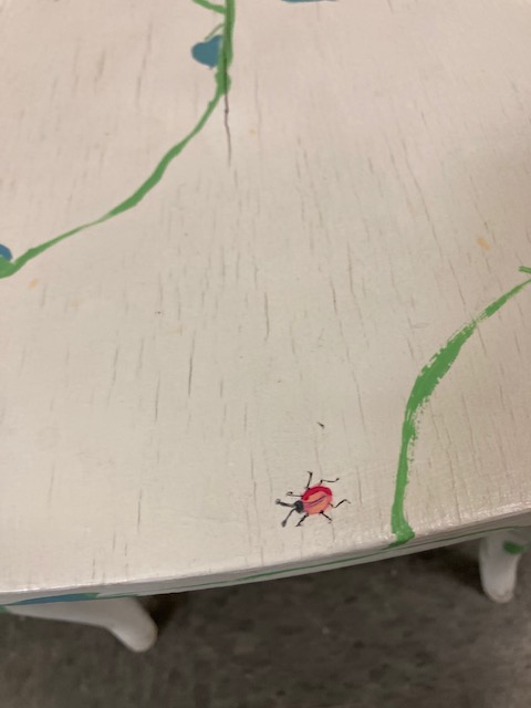 I have a few old chairs that I use outside in my gardens as plant stands – this would fit right in with them! How cute is it, anyway? Look at the little ladybugs scattered here and there!