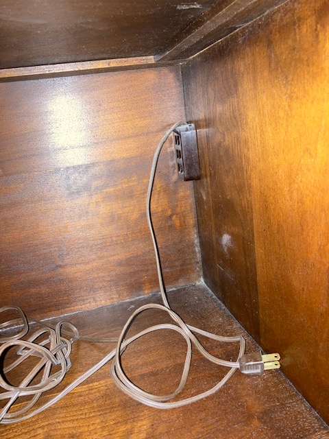 Each has a built in electrical cord, although I haven’t quite figured that out yet. It’s probably quite obvious to someone else, but I haven’t checked them over carefully enough to know. Perhaps there’s a small light in the cabinet?