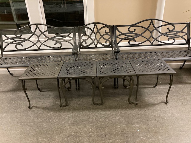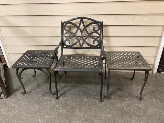 This is a decent, fairly lightweight but durable patio set consisting of 2 benches, a chair and 2 side tables (2 have sold). Because each piece is made of aluminum, not cast iron, you won’t see the rust that iron is prone to – and they’re not nearly as heavy to move around or put into storage.